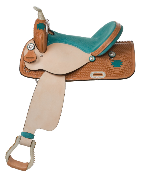 401 Aztec Barrel #401 Aztec Barrel Turquoise Lace Suede Tree: Poly-Ride 5 Year Guarantee Seat: 14", 15", 16" Lace Suede Horn: Rawhide Braided Cantle: 5" Cheyenne Roll Rigging: Stainless Steel C Skirts: Square